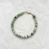 Beaded bracelet comprised of 4mm round and 6mm cylinder variegated jade stones. Color of jade stones will vary and each bracelet will be different and special. Available with either 14k gold fill or sterling silver clasp. Strung on sturdy flex wire. Length is approximate due to the fixed size of the beads. Expect bracelet to be slightly longer to allow interior space for the stones inside the wrist.